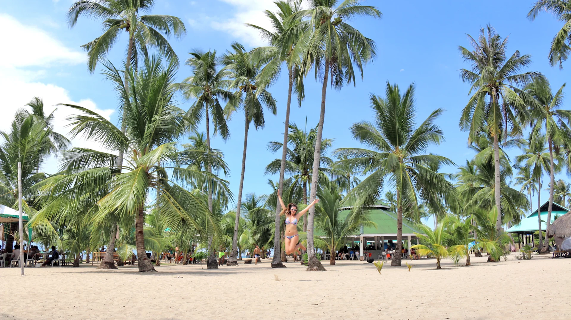Deanna jumping on the sand on Cowrie island surrounded by tall palm trees